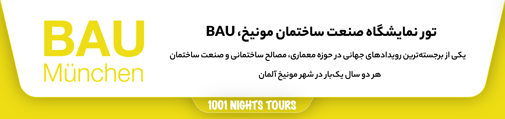 مجموعه سفرهای هزار و یک شب با سالها تجربه در برگزاری تورهای نمایشگاهی آلمان، شما را به بازدید از نمایشگاه BAU در مونیخ دعوت مینماید. ما مجموعهای جامع از خدمات مسافرتی را تدارک دیدهایم تا شما با آسودگی خاطر و تمرکز کامل بر اهداف تجاری خود، از این فرصت بینظیر بهرهمند گردید.